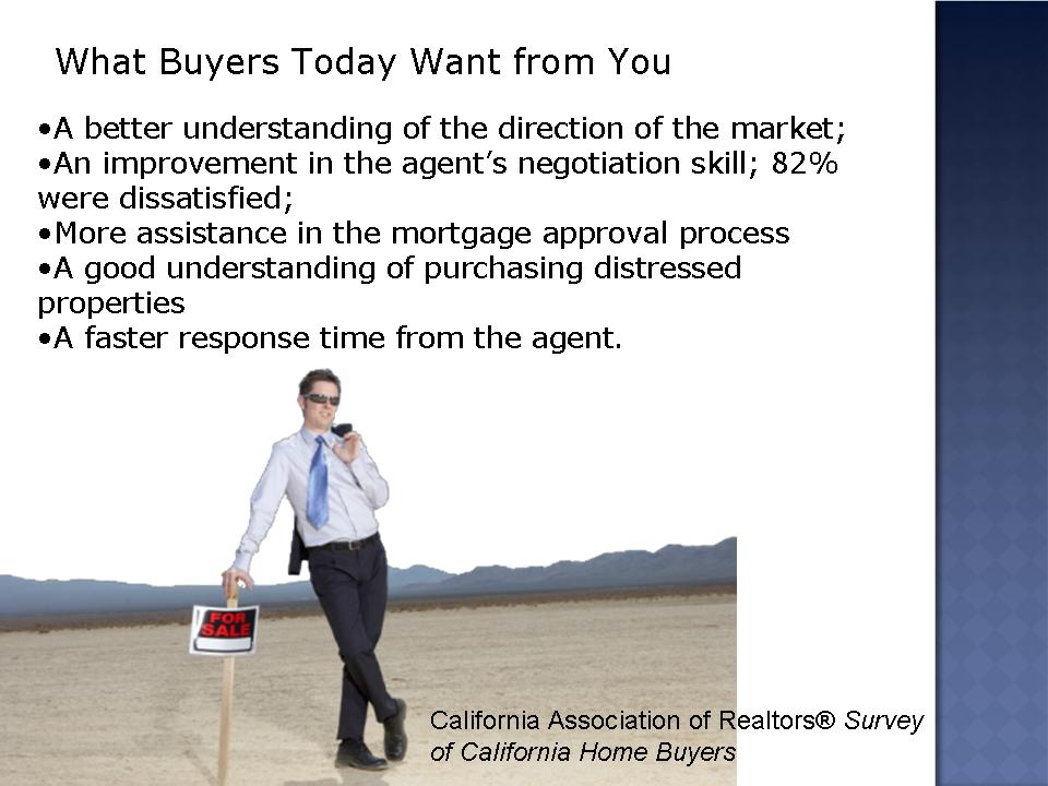 A�Besides surveying buyers and asking them to rate agents, the California Association of Realtors asked buyers exactly what they wanted from those buyersa�� agents. Here’s what buyers said: