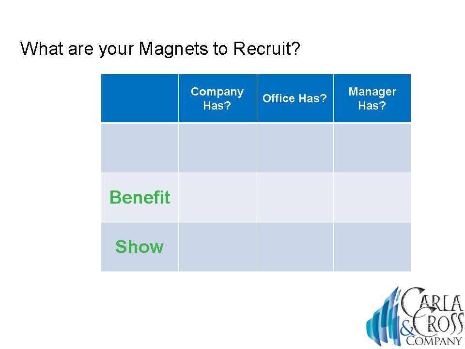 Historically, recruiters relied on company magnets to recruit. Today, those magnets have moved way past what the company offers, or even what your office offers. In fact, the weaker the recruiter, the more he/she relies on the company magnets to attract an agent. Example: