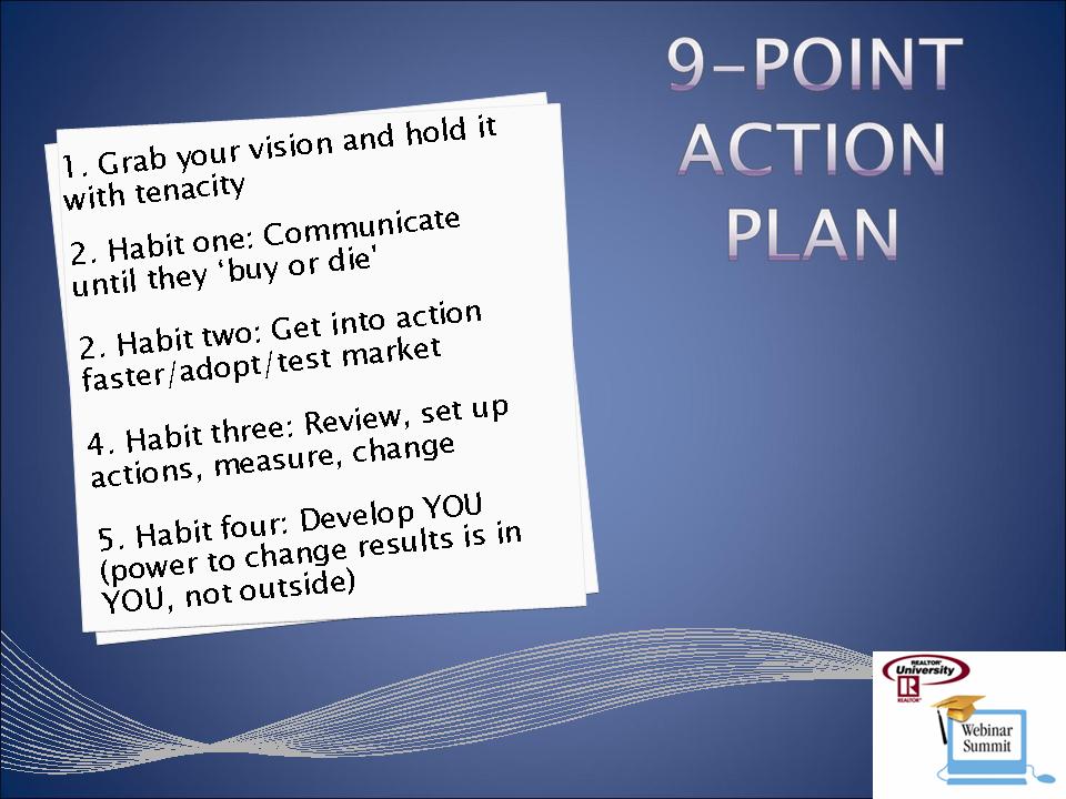 Darlene Lyons, owner of Broker/Agent Speakersa�� Bureau, gave me this tip when I started doing webinars. At the end of each webinar, I provide a 8-10 point action plan. I also make this action plan part of my handouts.